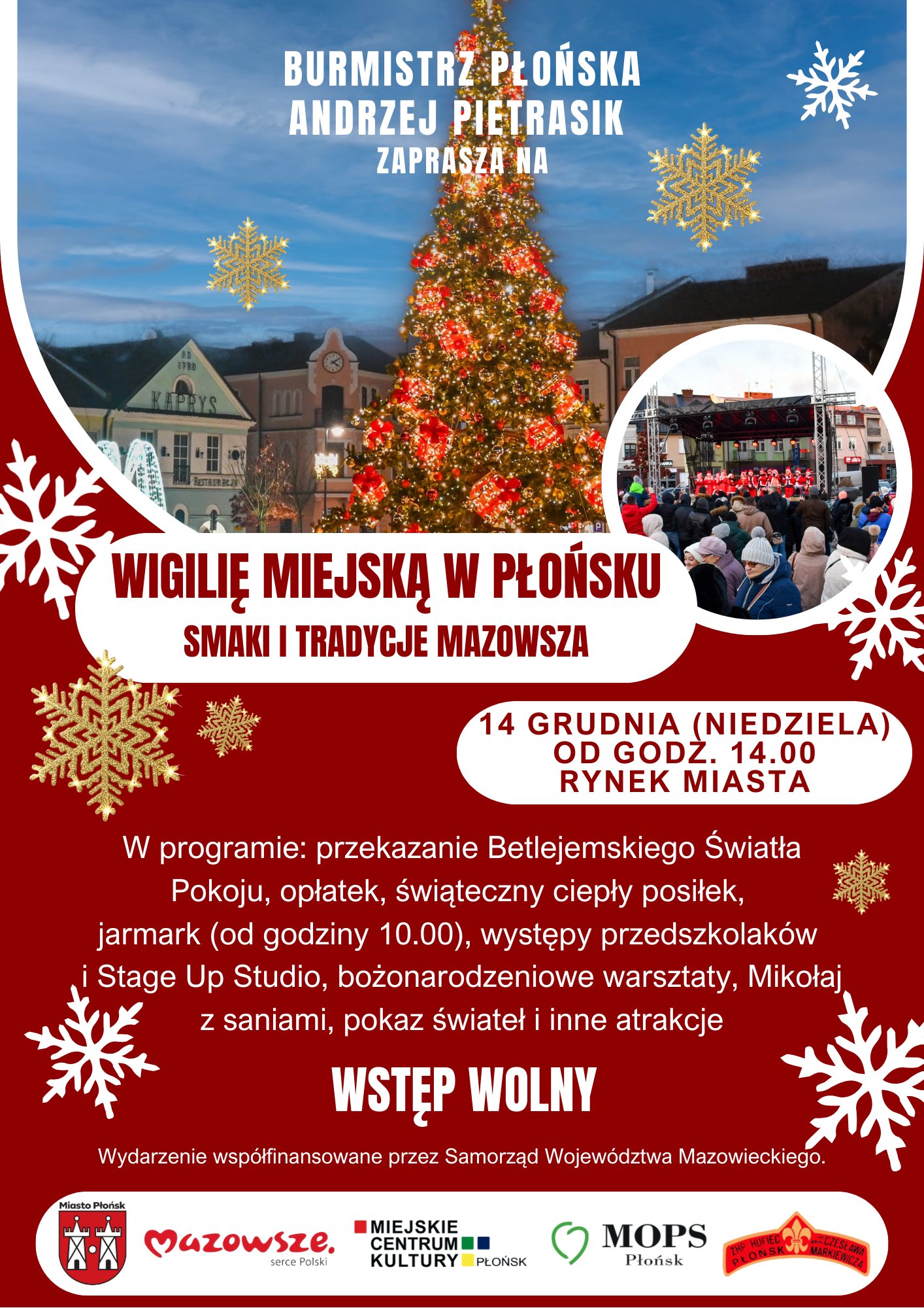 Samorząd Miasta Płońska zaprasza mieszkańców na plenerowe spotkanie w świątecznym klimacie. W programie wydarzenia: przekazanie Betlejemskiego Światła Pokoju, opłatek, świąteczny ciepły posiłek, jarmark (od godziny 10.00), występy przedszkolaków i Stage Up Studio, bożonarodzeniowe warsztaty, Mikołaj z saniami, pokaz świateł i inne atrakcje. Szczegóły na plakacie.