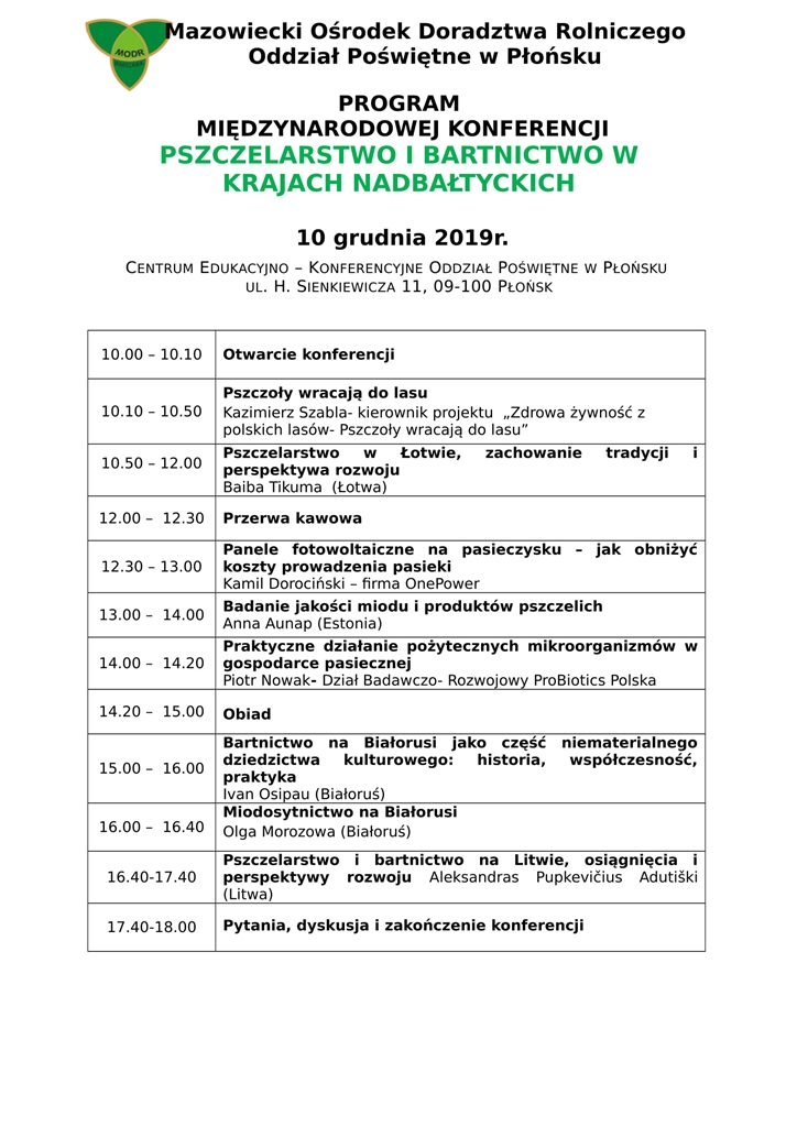 Mazowiecki Ośrodek Doradztwa Rolniczego o/Poświętne organizuje Międzynarodową Konferencję pt. Pszczelarstwo i bartnictwo w krajach nadbałtyckich, która odbędzie się 10 grudnia 2019 r. w Centrum Edukacyjno- Konferencyjnym w Płońsku. Współorganizatorem konferencji są Lasy Państwowe. Program spotkania poniżej.