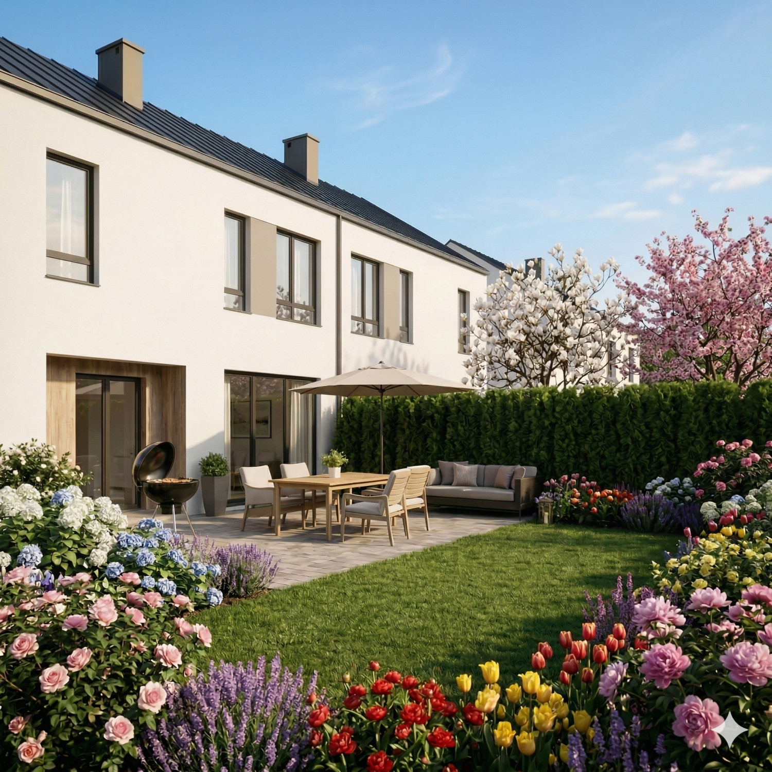 A za oknem? 113 metrów ogrodu. Nie balkon, nie taras wspólny — własna trawa, własne drzewa, własna cisza.