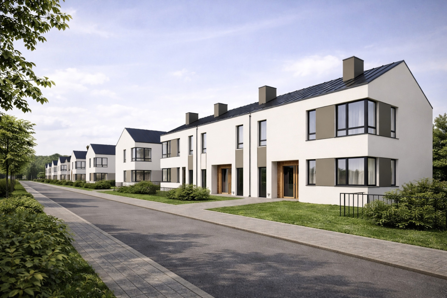 Jeśli zdecydujesz się wcześniej, możesz wprowadzić indywidualne zmiany, np. ogrzewanie podłogowe. Na terenie osiedla rosną drzewa i krzewy — zieleń to nie tylko prywatne ogródki, ale też otoczenie wspólne.