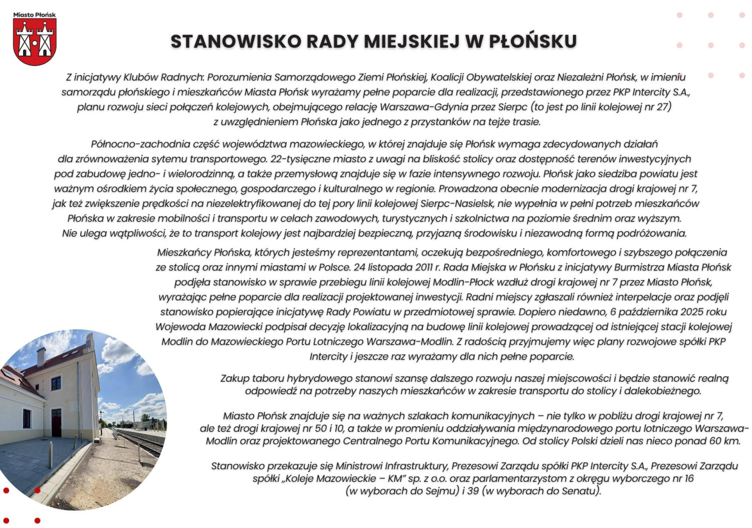 Radni podkreślają w stanowisku, że mieszkańcy Płońska – ważnego ośrodka społecznego, gospodarczego i kulturalnego w powiecie, znajdującego się w fazie intensywnego rozwoju oczekują bezpośredniego, komfortowego i szybszego połączenia ze stolicą oraz innymi miastami w Polsce. „Zakup taboru hybrydowego stanowi szansę dalszego rozwoju naszej miejscowości i będzie stanowić realną odpowiedź na potrzeby naszych mieszkańców w zakresie transportu do stolicy i dalekobieżnego” – piszą, co podkreśla w mediach społecznościowych Urząd Miasta w Płońsku.