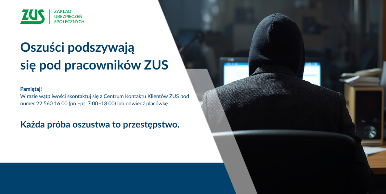 W razie wątpliwości skontaktuj się z Centrum Kontaktu Klientów ZUS pod numer 22 560 16 00 (pn.–pt. 7:00–18:00) lub odwiedź placówkę. Więcej informacji o tym, jak ustrzec się przed oszustwami, znajdziesz na stronie. Każda próba podszycia się pod ZUS to przestępstwo.